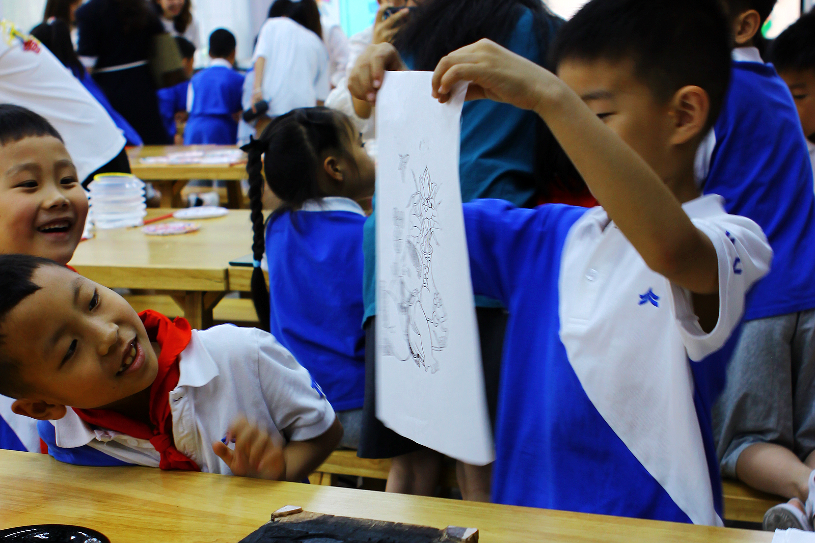 体验环节中,小朋友们在绵竹年画工作坊师生的带领下,亲自上手体验绵竹年画拓印、施彩技艺。现场气氛热烈,大家兴奋又激动,当一张张宣纸揭开,一幅幅精美的年画线稿展现于眼前,孩子们不断发出阵阵惊叹。张琴老师还为大家演示了绵竹年画独特的施彩技艺“鸳鸯笔”,之后,孩子们选择自己喜欢的线稿开始尝试施彩,最后,每位小朋友都完成了属于自己的年画作品。