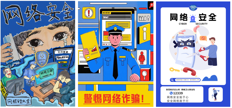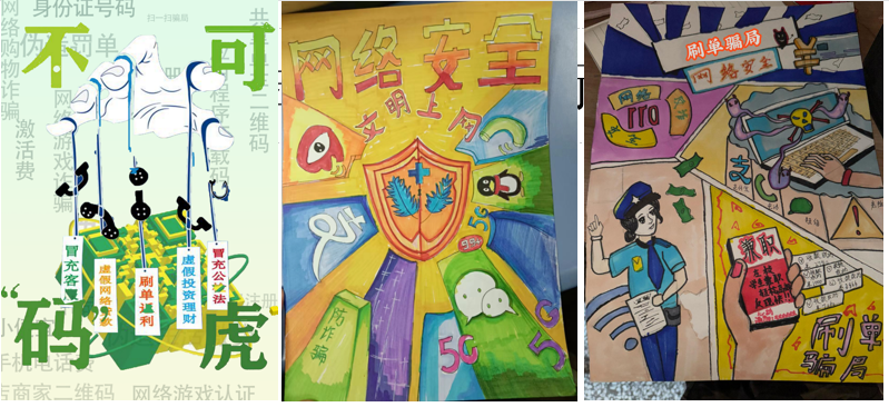 同学们作品风格多样,创意无限。有的作品巧妙融合传统与现代元素,以手绘漫画的形式展现网络安全小贴士;有的则运用抽象艺术手法,隐喻网络空间的复杂与脆弱;更有作品直接以震撼人心的数据或真实案例为素材,直观展现网络安全的紧迫性。每一幅作品都蕴含着创作者对网络安全问题的深刻理解和独到见解。