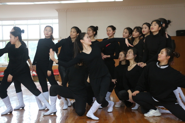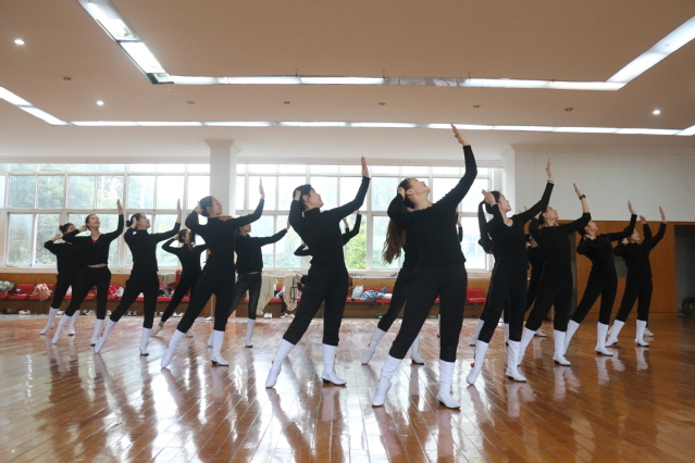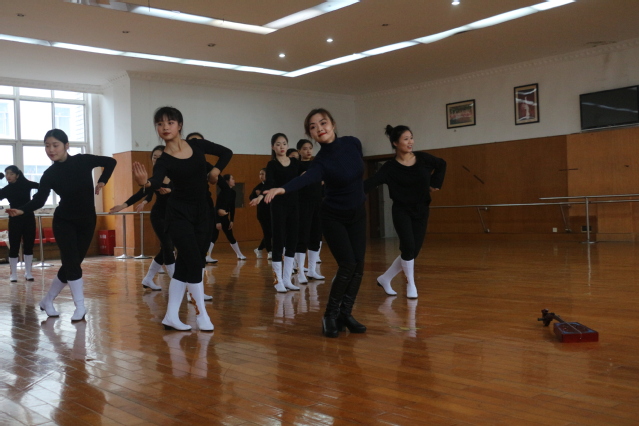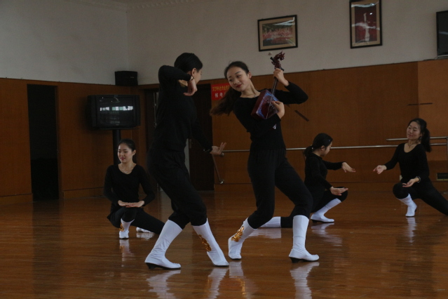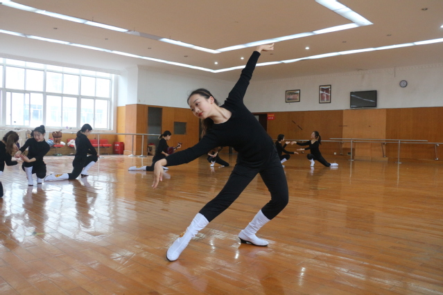 在简单热身后,舞蹈队的队员们首先进行了几次整体排练。在排练的过程中,余南老师认真的指导了每个队员的舞姿,并指出了个别动作中存在的不足以及对音乐感的把握。其中主要包括动作僵硬、脱离节奏、整体动作不整齐等问题。随后她们在余南老师的指导下,认真并积极的改进动作,克服不足,努力做到连贯整齐,动作与韵律一致。此舞蹈以“卫拉特布斯贵”为背景,运用舞蹈的形式再现那里的人文风情,突出表现舞蹈中所带有的精悍潇洒与娇媚的身段。为了突出特性,此舞蹈有不少步调转换和大跳的排编设计,队员们能够完成这些高难度动作与老师平时对大家的耐心指导及严格要求分不开。