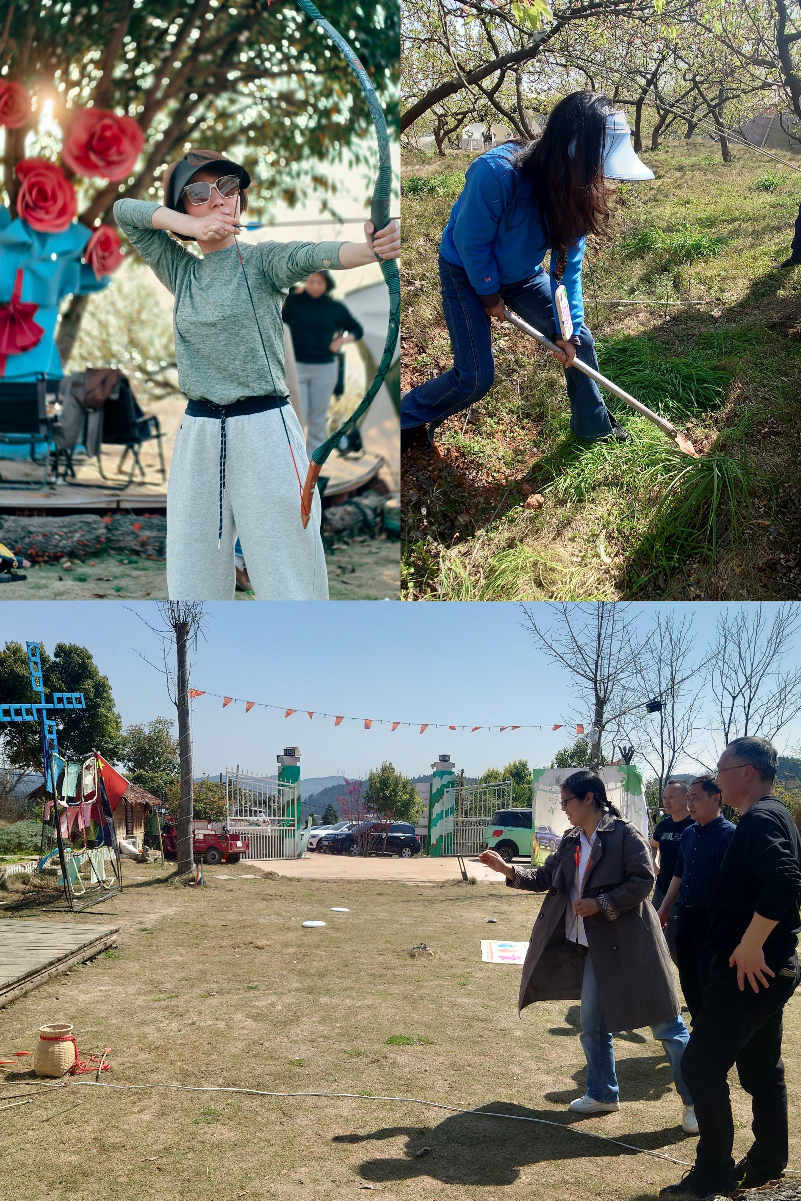伴着明媚的春光,老师们陆续抵达双东镇户外营地,在专业教练的指导下分组体验传统射箭项目。徐老师首次尝试便命中靶心,引来一片赞叹。随后的投壶游戏中,各组队员凝神静气、精准投掷、现场掌声不断。