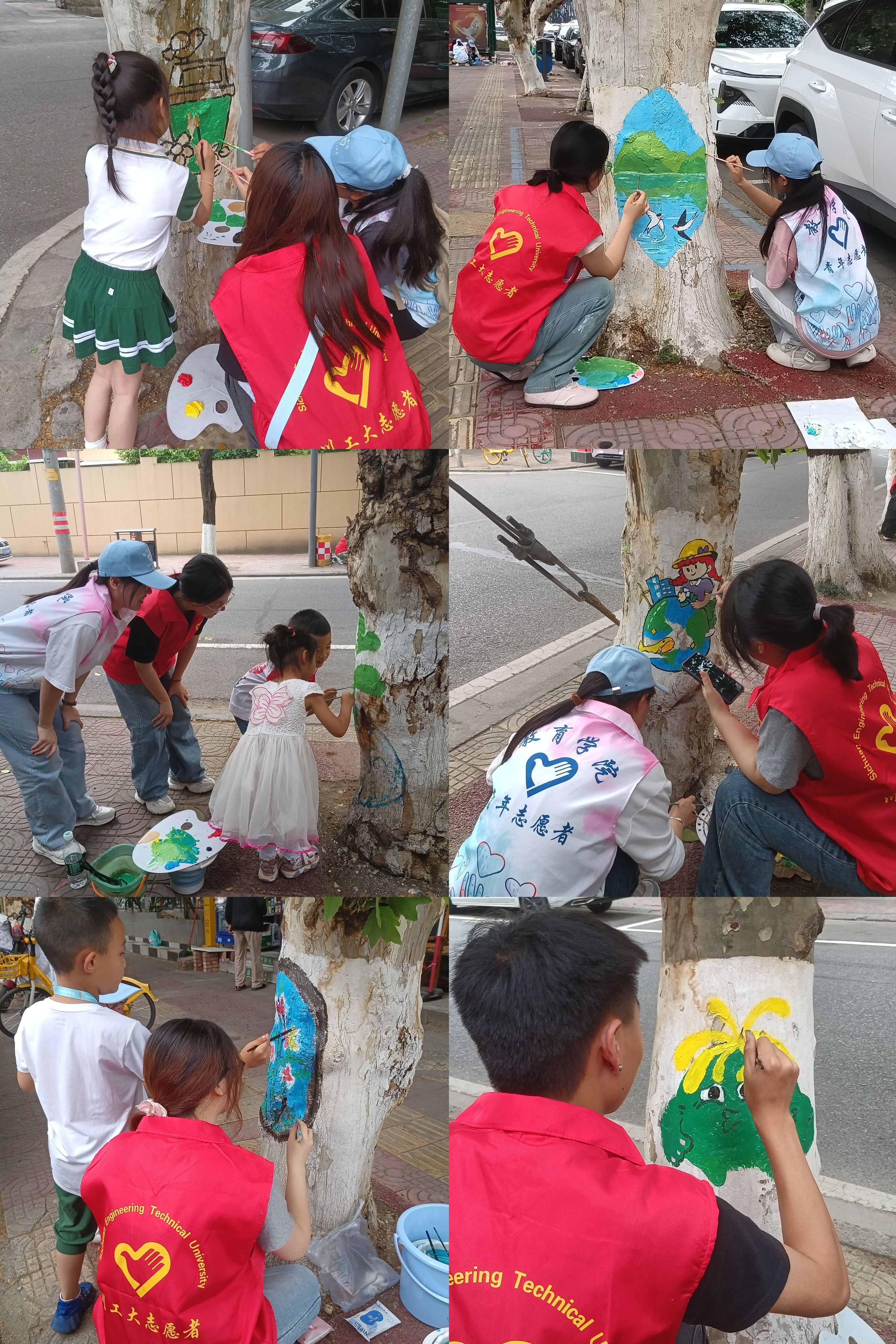 5月17日上午,在德阳市旌阳区绵远街道上,新利网上登陆艺术学院和教育学院的40名志愿者手执画笔,联合卢梭幼儿园师生,以树干为画布,开展“生态共生·文化传承”主题城市美化彩绘活动,用缤纷色彩为城市注入艺术与文化活力。