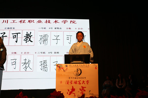 本次比赛共有四位评委老师,由一位念题,三位评分。在观众充满疑惑时评委老师会解释扣分的缘由。此次比赛分为两个部分,第一部分进行汉字听写;第二部分是在过程中插入了中国文化常识的游戏,例如:看图猜成语、成语接龙、你来比我来猜等。现场同学也积极参与其中,在赢得奖品的同时也领略了文化的博大精深。在选手听写时台下的观众为台上的同学创造了良好的比赛氛围。