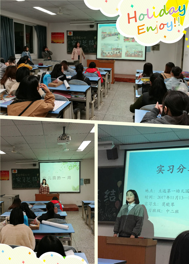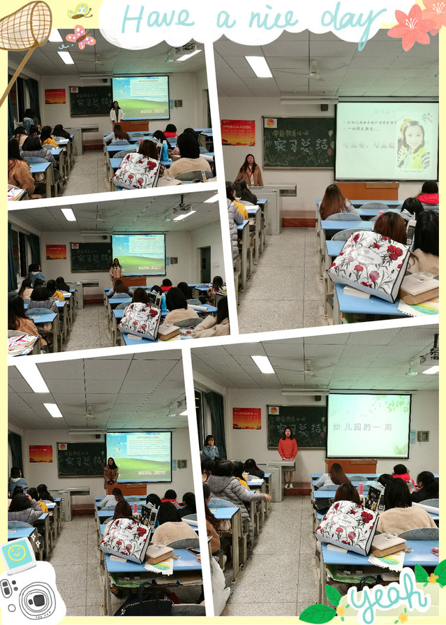 会议由主持人宣布班会开始,第一项内容就是同学们分享自己在见习时的趣事和学到的经验。我们班的同学分为两组,一组在立达一幼,一组在立达二幼。两个幼儿园都有自己的特色,每个见习的同学感受也有所不同。所以,同学们在班会时都很积极地一个挨一个地上台讲述自己的感受,有的同学很认真,准备了PPT,没准备PPT的同学也讲的绘声绘色的,大家都听得很认真,引起了很多的共鸣。