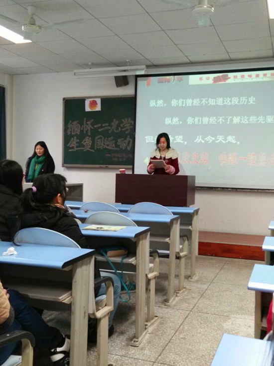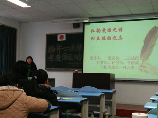 2014年12月10日,学前教育2014级2班团支部在一教212 顺利开展“缅怀12.9学生爱国运动”团组织生活。