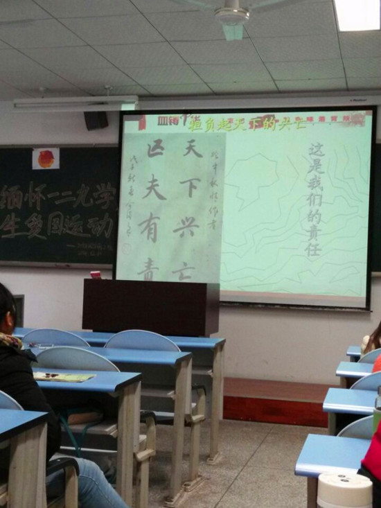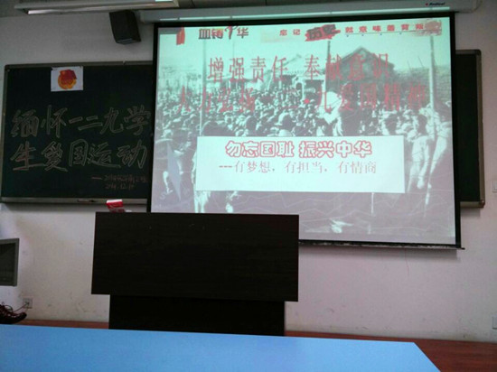 在全体齐唱中国共青团团歌后,团支书就中国近代史开端的提问引起了同学们的积极回答,引出了本次爱国运动的主题。在讲解了12.9爱国运动的背景、历程、意义后,同学们观看了12.9爱国运动的相关视频。同学代表还声情并茂的朗诵了相关文章。针对爱国运动这一话题,同学们进行了热烈的讨论,纷纷表示,缅怀那段血与泪写成的历史,是为了发扬12.9铸成的爱国精神。同学们还结合中日关系踊跃发言,表示要从现在做起,为中华之富强而读书。