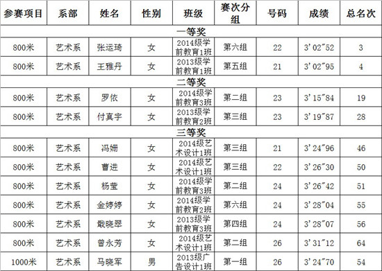 “冬季长跑启动仪式现在开始。”铿锵而有力的号令一出,各系代表队迈着整齐的步子,井然有序地按照指定路线跑了起来。集体长跑结束后,男子1000米和女子800米竞相上演。跑道上运动员们努力奔跑着,寒冷的天气丝毫没有影响他们跑步的激情。跑道旁的啦啦队,加油呐喊声此起彼伏,现场热情欢快。比赛在激烈的进行着,我系的同学们也毫不退让,奋勇直追。最终,在大家的共同努力下,我系在集体项目中获得团体三等奖,个人项目中赢得得一等奖2名,二等奖2名,三等奖7名。