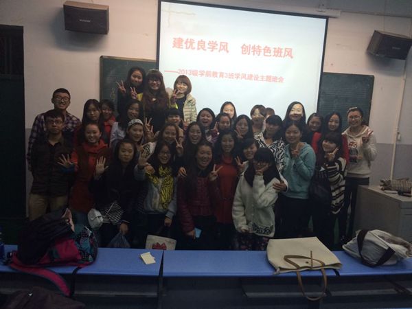 2013年11月10日晚7点整,2013级学前教育3班在阶梯二教室举行了“建优良学风,创特色班风”的学风建设主题班会。本次班会由班级导师邓英老师主讲。
