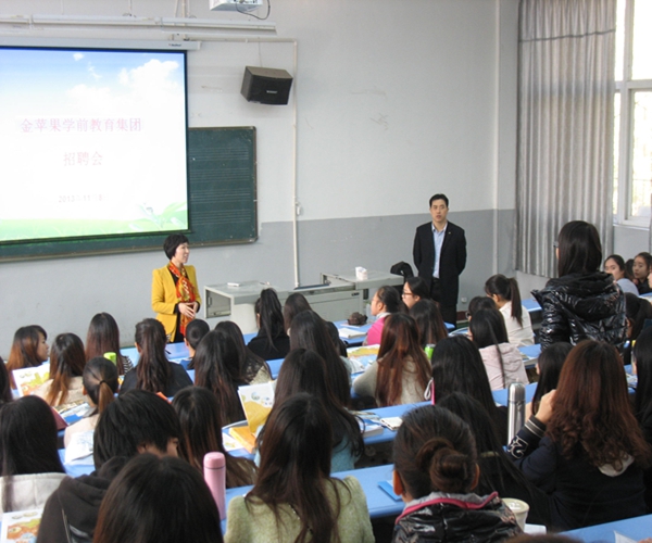 2013年11月8日,金苹果教育投资集团来艺术系招聘幼儿教师。本次招聘会分两个环节——宣讲和组织面试。