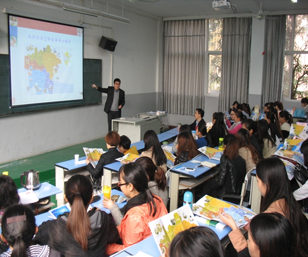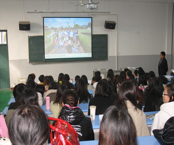 上午的宣讲会在阶二教室举行,参加上午宣讲会的有学前教育专业大三的学生和部分大二的学生,艺术系张友主任、王静书记以及学前教育专业的几位老师也参加了宣讲会。在会上,金苹果教育投资集团的郭老师从办园历史、办园规模、幼儿园的环境与硬件设备、课程研发、教师团队等多个方面向大家展示并介绍了金苹果教育集团的整体发展情况。金苹果幼儿园所透露出来的“国际化和现代化”,引来了阵阵的赞叹和惊呼;他们所提供的舒适的工作环境、优厚的福利待遇和广阔的发展空间,更引起了大家极大的兴趣。随后,来招聘的几位老师与同学们进行了广泛的互动交流,耐心地回答了大家在就业的过程中所关心的一些问题,对同学们有很大的启发和帮助。
