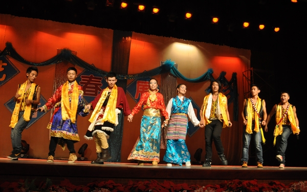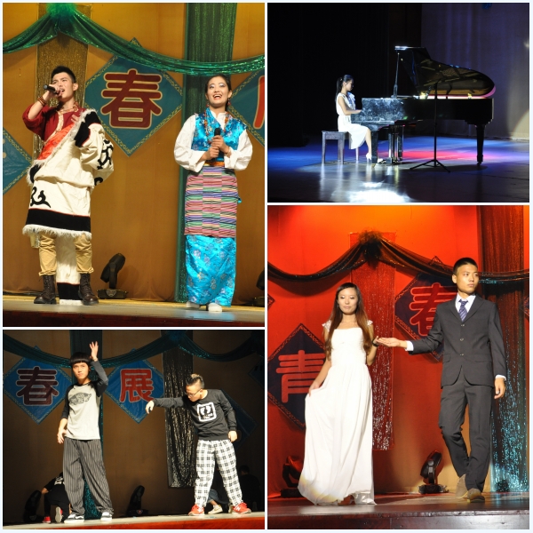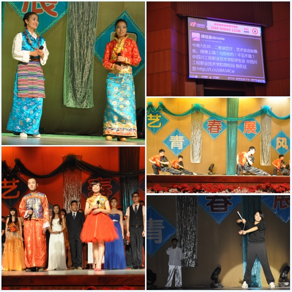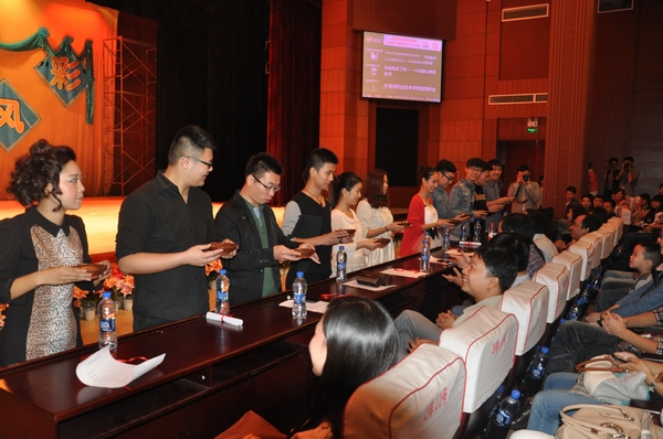 跟随者开场舞的动感节奏,晚会拉开了帷幕。年轻姑娘们充满活力和热情的舞步,点燃了全场观众的激情。随后的歌舞、钢琴、朗诵、武术、民族歌曲大联唱、T台秀等精彩纷呈的节目为观众呈现了一场视听盛宴。钢琴演奏《眼泪》和独唱《醉清风》灵动而舒缓的节奏引领大家渐入佳境;街舞社同学表演的街舞《万万没想到》动作娴熟巧妙,令人叹服;武术协会的同学充满力量的武术表演,一招一式尽显精神,令人振奋,让我们切实感觉到了《少年中国强》;少数民族同学带来的民歌大联唱《藏彝之声》,高亢嘹亮的歌声和热情奔放的旋律将晚会推向了高潮。整场晚会精彩不断,高潮迭起,赢得台下阵阵掌声,欢呼声一浪高过一浪。在动人心弦的美声演唱《我爱你,中国》后,2013级新同学带来了青春时尚的T台秀《迷影》,展现了当代大学生的精神和风采。晚会中间,老师为艺术系团总支、学生会2011级学生干部颁发了荣誉证书,对他们的工作表示肯定,感谢他们在迎新工作中所付出的努力。本次晚会还特别开通了微博互动环节,来自校内外的师生纷纷通过网络微博平台,表达了对艺术系的祝福和对2013级新同学的欢迎!