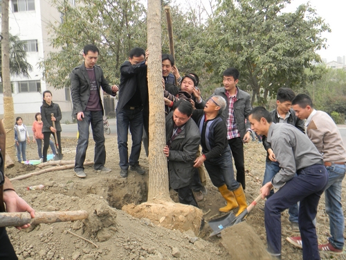 一开始,男老师和男同学们齐心协力把躺在地上的大树扶起来,其他同学就埋土浇水。不一会儿,几棵大树就屹立在我们面前。大家看到自己的劳动成果,不论是老师还是同学,脸上都洋溢着满意的笑容。