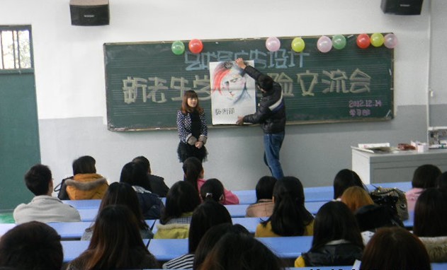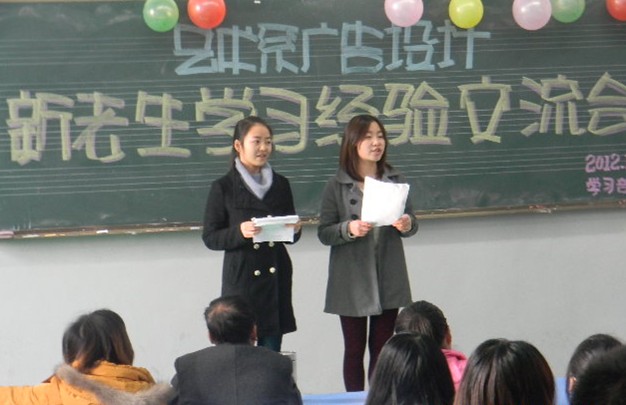 2012年12月14日中午1点,艺术系学习部组织在学院阶梯教室一楼举行,广告设计专业新老生学习经验交流会。艺术系唐发新老师、广告设计专业辅导员彭丽老师参加了学习经验交流会。这次学习经验交流会召集了艺术系2012级广告设计班同学,以及部分大二干事,主要目的就是让大二同学们传授学习生活经验,让大一同学们完善自我学习的方法,并带动所有的同学积极向上,相互交流学习经验。