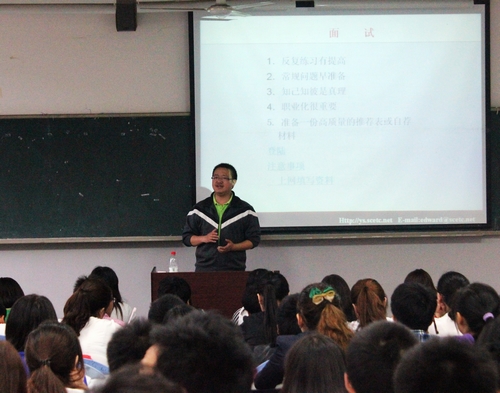 王书记首先对当前的就业形势作了简单的分析,然后围绕面试的技巧、简历的设计、简历中常见错误等几大方面展开讲解。最后,王书记希望大家能够认识自我,准确定位,合理调整就业期望值。王书记的讲话赢得了同学们热烈的掌声,不少同学表示“这次讲座就像是一场即时雨一样,迷茫的问题得到了解答,受益匪浅。”