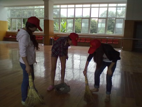 2012年6月5日下午,艺术系六名志愿者在艺体中心参加了“学习雷锋,创干净和谐校园”的志愿者活动。在青志队相关人员的安排下,志愿者们分工协作,有的扫地,有的拖地,有的擦窗户,艺体中心里里外外很快被打扫干净。打扫完之后,志愿者们还仔细的检查着是否还有没有清扫到的地方,不放过一个角落。在大家的共同努力下,艺体中心焕然一新,这是志愿者们辛勤劳动下的结果。